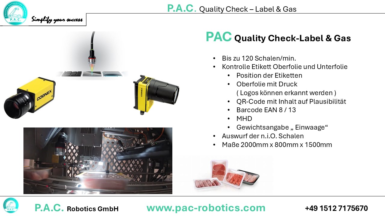 Automatisiertes Inspektionssystem PAC Quality Check Label & Gas Dieses System kontrolliert indirekt die Dichtigkeit einer versiegelten Schale, sowie das Ober u. Unter Etikett.